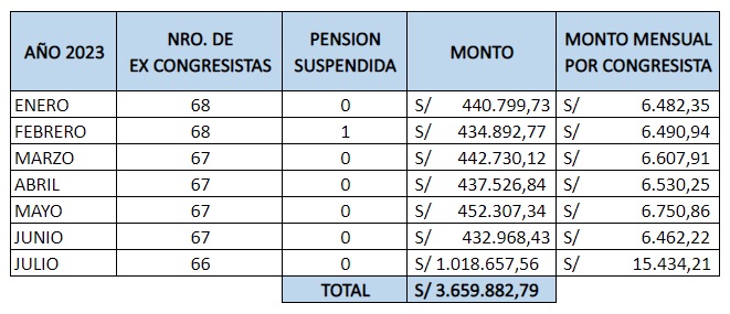 Tomando como ejemplo el mes de julio del presente año, se ha registrado que se ha destinado una suma que supera el millón de soles, exactamente S/1,018,657.56, para cumplir con el compromiso de 66 jubilaciones parlamentarias.