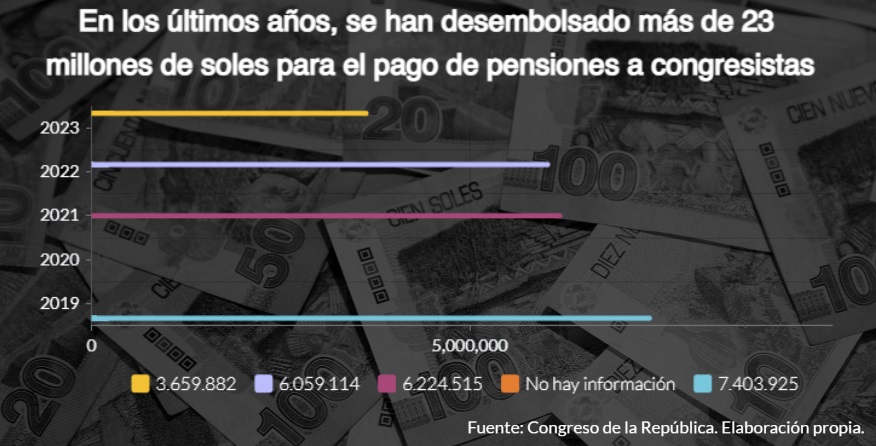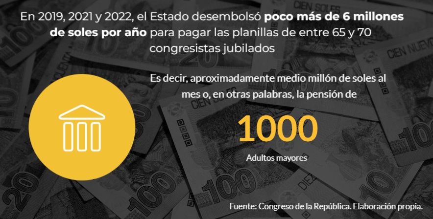 Un análisis de Latina Noticias sobre la información que se publica en el portal de transparencia del Congreso de la República revela que, al mes, se destinan más de 450.000 soles para pagar las jubilaciones de entre 65 y 79 exparlamentarios. Esta cifra se duplica durante los meses de Fiestas Patrias y Navidad debido al aguinaldo que reciben. Solo en julio de este año, el Legislativo destinó más de S/1.018,657.56 para este propósito.