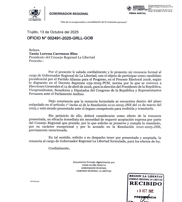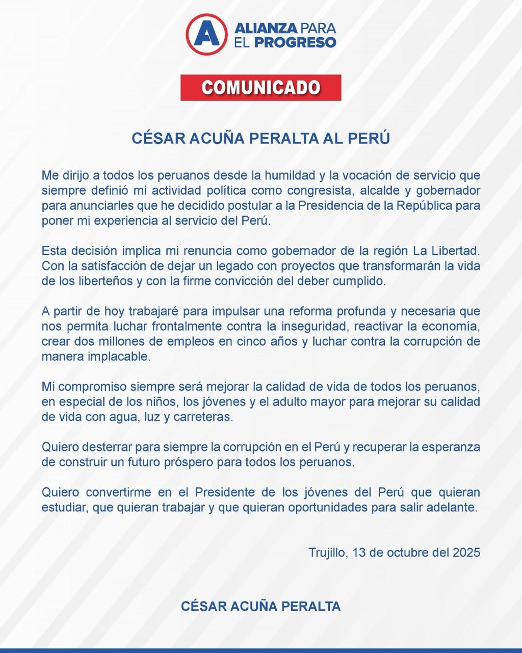 Lo último. A través de un comunicado del partido político, Alianza Para el Progreso, César Acuña Peralta anunció su renuncia como gobernador regional de La Libertad para lanzar su candidatura en las Elecciones Presidenciales 2026.