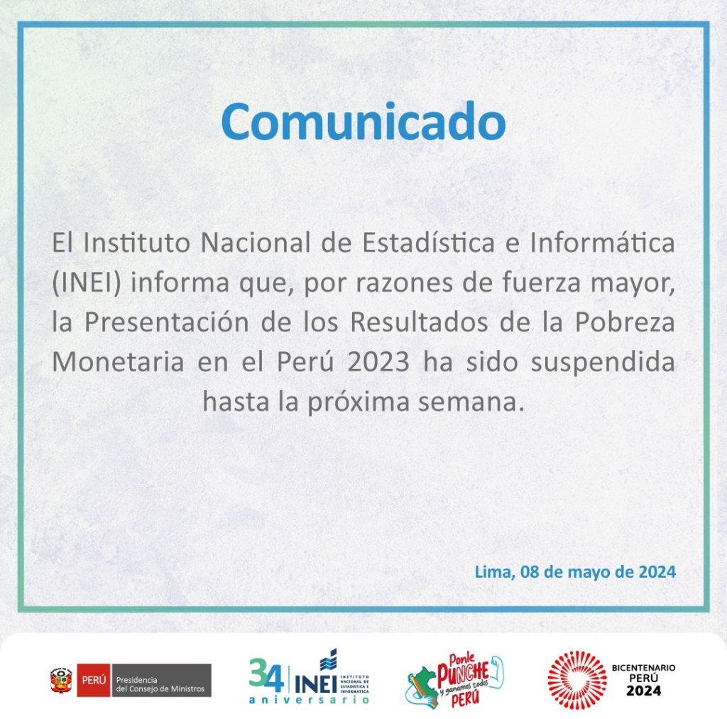 El informe, que estaba programado para ser presentado al público este jueves 9 de mayo a las 11 de la mañana, había generado gran expectativa en la sociedad peruana y en los sectores políticos y económicos del país; sin embargo, apenas horas después de anunciarse la fecha de presentación, las cuentas oficiales del INEI emitieron un comunicado informando la suspensión del evento debido a “motivos de fuerza mayor”.