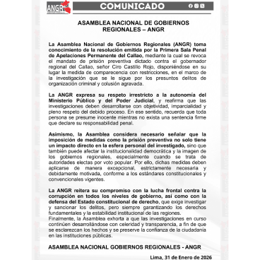 “La Asamblea considera necesario señalar que la imposición de medidas como la prisión preventiva no solo tiene un impacto directo en la esfera personal del investigado, sino que también puede afectar la institucionalidad democrática y la imagen de los gobiernos regionales”, se lee en el comunicado.