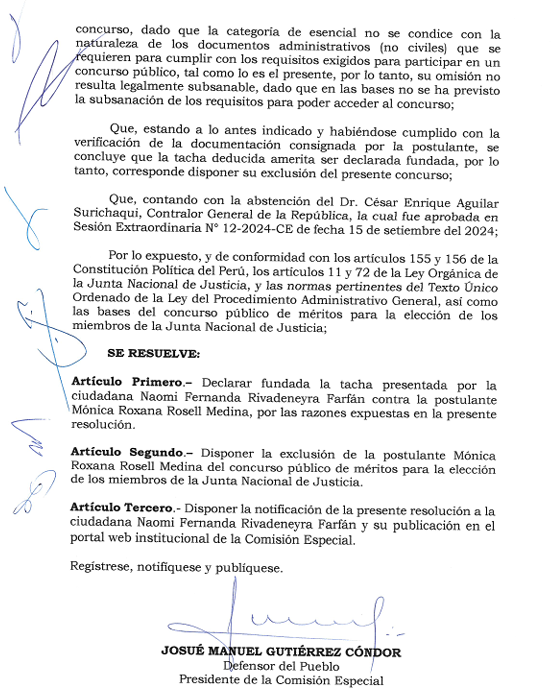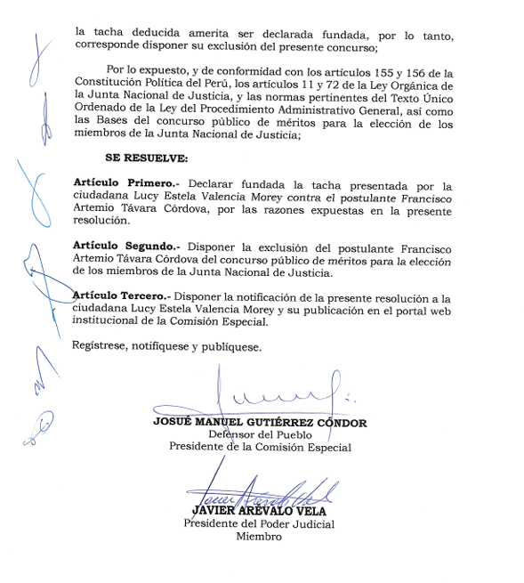 La Comisión Especial que elegirá a los nuevos miembros de la Junta Nacional de Justicia (JNJ) decidió excluir a los abogados Francisco Távara y Mónica Rosell del proceso tras declararse fundadas tachas presentadas por ciudadanos. Así se pueden visualizar en esas resoluciones de este grupo liderado por el defensor del Pueblo, Josué Gutiérrez.