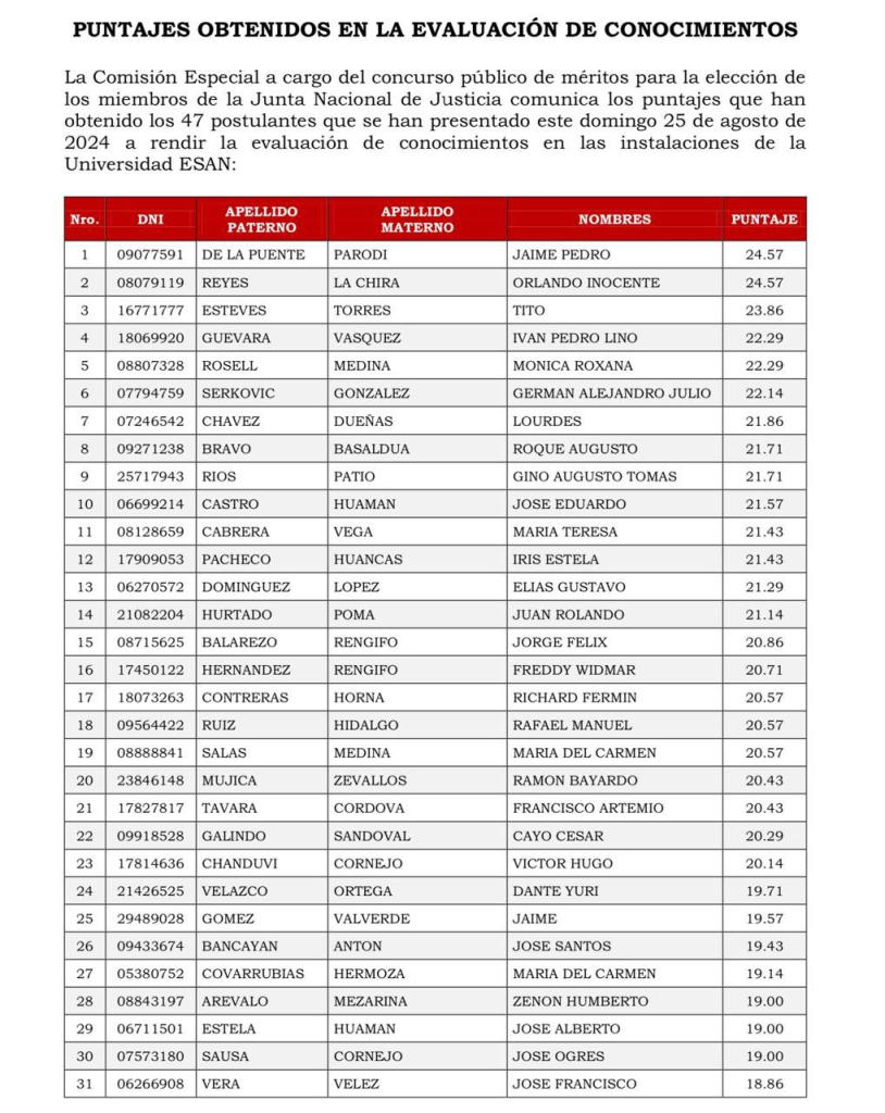 No obstante, De la Puente decidió declinar la invitación para integrar la JNJ. De otro lado, Orlando Reyes Chira le sigue en la lista con los mismos puntos. Los demás que pasaron la nota mínima, que era de 20 puntos, son Tito Esteves Torres, Iván Guevara Vásquez, Mónica Rosell Medina, quien también participó en el primer proceso para ser parte de la JNJ y quedó como accesitaria, Germán Serkovic González.
