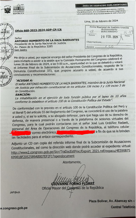 Giovanni Forno Florez, Oficial Mayor del Parlamento, envió la comunicación a Antonio de la Haza Barrantes, presidente de la JNJ, para que se presente a inicios de la próxima semana junto a sus colegas Aldo Vásquez, Imelda Tumialán, María Zavala y Guillermo Thornberry, quienes deberán asistir con sus respectivos abogados. Le has otorgado la posibilidad de que lo hagan de manera presencial o virtual.