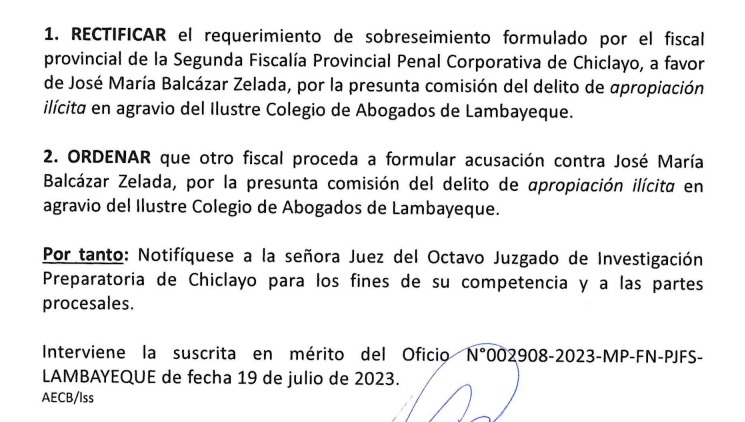 La fiscal adjunta Anita Cabrejos, mediante la disposición n.° 2 con fecha del 8 de setiembre, ha anulado el sobreseimiento otorgado previamente a favor de José María Balcázar. Además, ha emitido una orden para que otro magistrado presente los cargos por apropiación ilícita contra el congresista.