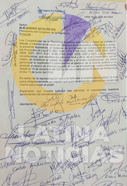 Congresistas de siete bancadas y no agrupados suscribieron una carta dirigida a Alejandro Soto, titular de la Mesa Directiva del Parlamento, para que priorice con urgencia en las sesiones del Pleno que se realizarán hasta este sábado 15 el dictamen que amplía los impedimentos para postular a sentenciados por graves delitos, como secuestro y homicidio, a cargos públicos. Esto con miras a las elecciones generales del 2026.