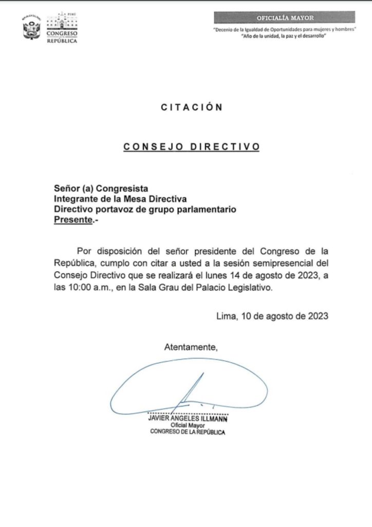 Para este lunes 14 de agosto, a las 10 de la mañana sesionará el Consejo Directivo del Congreso de la República y a las 3 de la tarde hará lo mismo el pleno, donde los legisladores discutirán sobre la aprobación del cuadro de comisiones para el Periodo Anual de Sesiones 2023-2024.