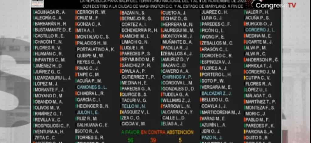 El Pleno del Congreso aprobó el viaje de Dina Boluarte con 65 votos a favor, 42 en contra y 5 abstenciones.