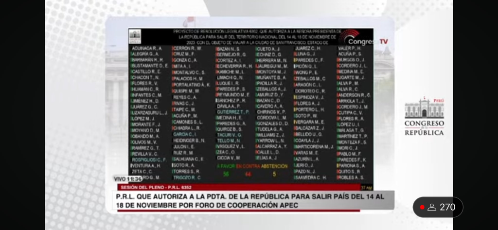 El pleno del Congreso aprobó el viaje de la presidenta Dina Boluarte, con 65 votos a favor, 44 votos en contra y 5 votos abstención, a fin de atender la celebración del foro de Cooperación Económica Asia Pacífico (APEC) en Estados Unidos.