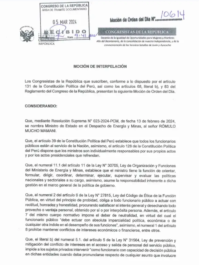 En esa misma línea, el Presidente del Congreso, Alejandro Soto, mencionó que el próximo lunes 25 de marzo, Rómulo Mucho, titular del Minem, deberá presentarse en el parlamento, desde las 6: 00 pm. Para responder las 17 preguntas que ya se encuentran en la moción del día 10614