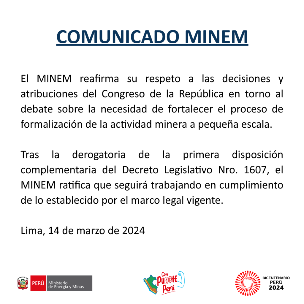 Hay que señalar que la Sociedad Nacional de Minería, Petróleo y Energía (SNMPE) expresó su rechazo a la decisión del Congreso de la República de derogar el Decreto Legislativo 1607 que establecía un freno a la minería ilegal y fortalecía la formalización de la actividad.
