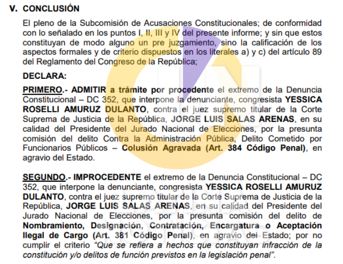 La Subcomisión de Acusaciones Constitucionales (SAC) del Congreso debatirá por la tarde de este martes 16 de abril la admisión a trámite de un informe de calificación de la denuncia constitucional presentada por la legisladora Rosselli Amuruz contra el presidente del Jurado Nacional de Elecciones, Jorge Luis Salas Arenas, por la presunta contratación de un consultor durante su gestión, que acabará a fin de este 2024.