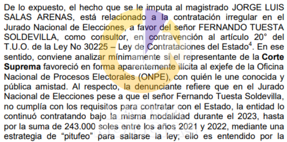 “Por lo expuesto, el Jurado Nacional de Elecciones bajo la presidencia de Jorge Luis Salas Arenas, habría contratado irregularmente al exjefe de la ONPE, Fernando Tuesta Soldevilla, conforme a lo advertido por la Contraloría General de la República; de modo que, los presuntos hechos atribuidos al denunciado harían presumir un presunta concertación de voluntades con la finalidad de defraudar al Estado, lo cual denota un abuso de poder por parte del denunciado”, concluye el documento.