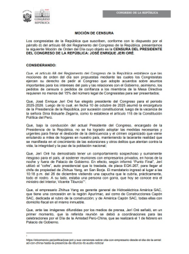 Consecuencias. La congresista Sigrid Bazán, de la bancada Bloque Democrático y que postula a las elecciones 2026 con la alianza Venceremos, ha publicado en sus redes sociales oficiales la moción de censura que ha de presentar al Congreso para vacar la Mesa Directiva del gobierno de José Jerí. En la actualidad, se encuentra recolectando firmas.