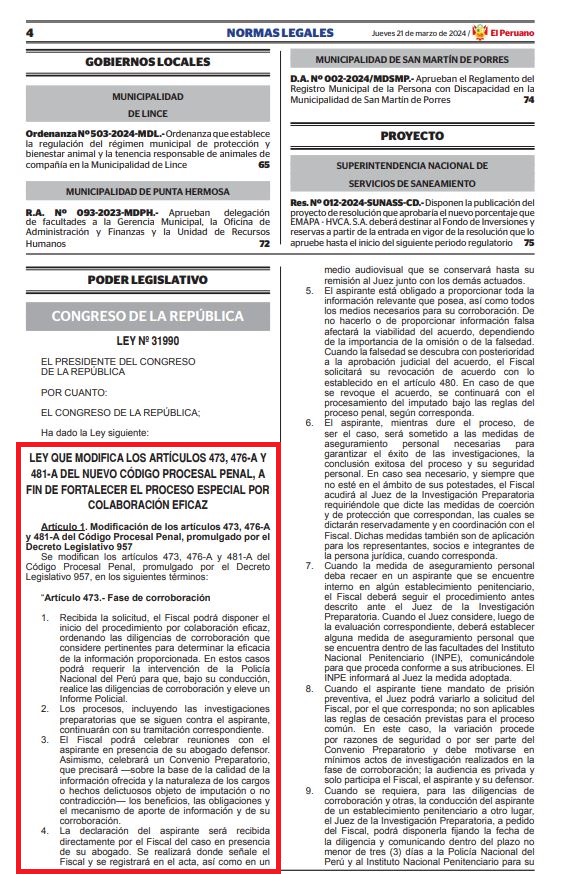 La Ley Nº 31990, publicada en el boletín de normas legales del diario oficial El Peruano, modifica los artículos 473, 476-A y 481-A del Nuevo Código Procesal Penal, referidos al proceso especial por colaboración eficaz.