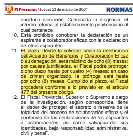 El Congreso de la República publicó este jueves 21 de marzo la ley que limita la figura de la colaboración eficaz en un plazo máximo de ocho meses, una iniciativa que fue aprobada por insistencia a mediados de diciembre de 2023 pese a que el Ejecutivo había observado dicha autógrafa y propuesto un plazo de 36 meses improrrogables.