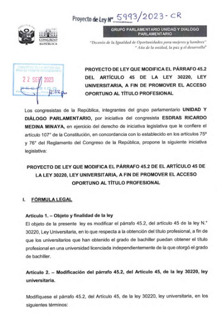 La bancada de Unidad y Diálogo Parlamentario ha presentado un proyecto de ley que busca permitir que los bachilleres puedan obtener su título profesional en cualquier universidad licenciada en el Perú. Esta iniciativa, planteada por el congresista Esdras Medina, tiene como objetivo enmendar el párrafo 45.2 del artículo 45 de la Ley 30220, conocida como Ley Universitaria.