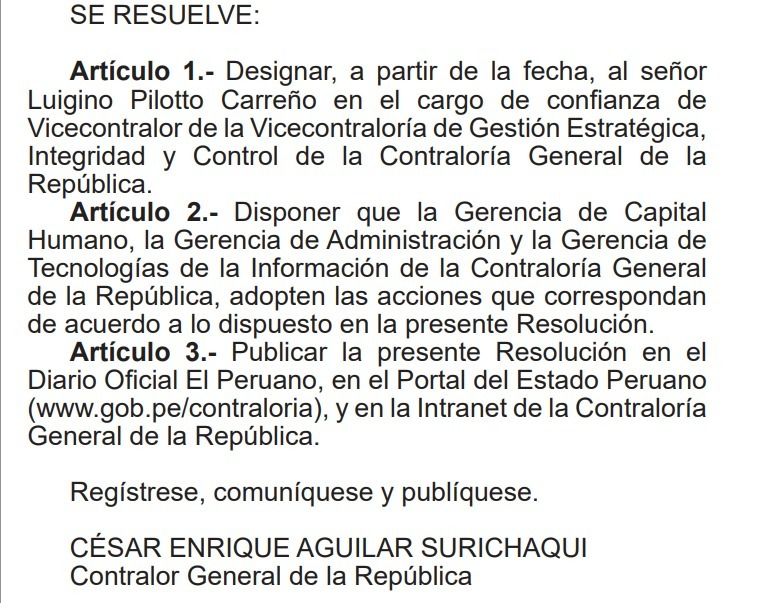 El contralor César Aguilar designó como vicecontralor de Gestión Estratégica, Integridad y Control a Luigino Pilotto Carreño en reemplazo de Luis Miguel Iglesias León, quien ostentaba este cargo momentáneamente y que ahora presentó su carta de renuncia. Así aparece en un resolución publicada en el diario oficial El Peruano.