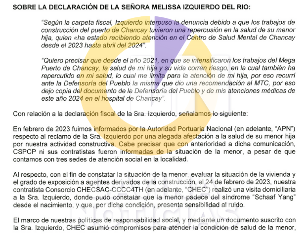 Al respecto, Izquierdo señaló que acudió a la Fiscalía para acusar que los trabajos realizados por el consorcio de origen chino y peruano había tenido repercusión en la salud de su menor hija que incluso fue llevada al Centro de Salud Mental de Chancay desde el 2023 hasta abril pasado.