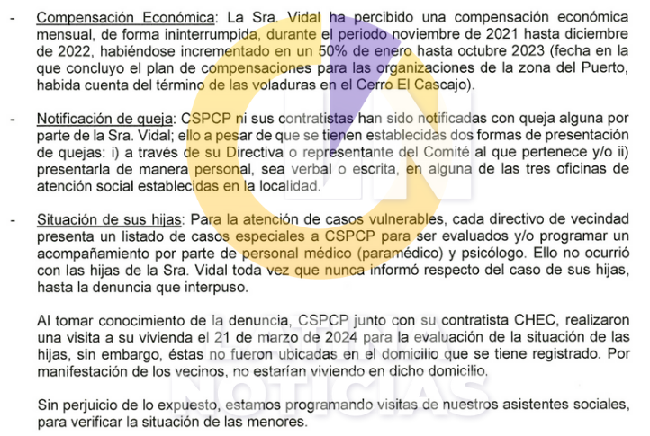 “CSPCP ni sus contratistas han sido notificadas con queja alguna por parte de la Sra Vidal, ello a pesar de que tienen establecidas dos formas de presentación de quejas: I) a través de su directiva o representante del comité al que pertenece y/o ii) presentarla de manera personal, sea verbal o escrita, en alguna de las tres oficinas de atención social establecidas en la localidad”, apuntaron.
