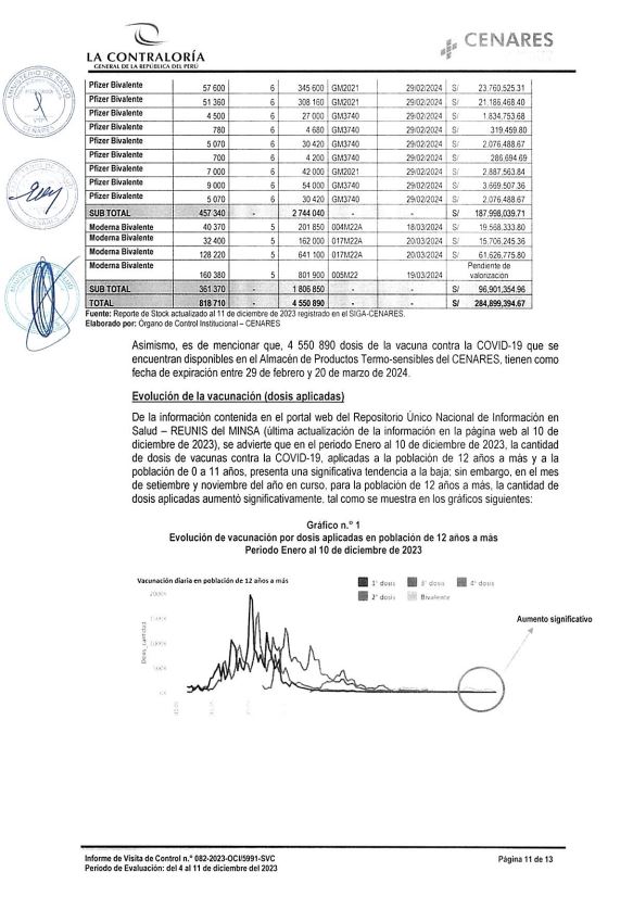 “De la revisión a la información contenida en los reportes mensuales de stock disponibles de productos, emitidos por la Dirección de Almacén y Distribución del CENARES y el stock disponible registrado en el SIGA-CENARES, al 11 de diciembre de 2023, se advierte que el stock de vacunas contra la COVID-19 es de 4 550 890 dosis. con un valor de adquisición de S/ 284 899 394.67, tal como se muestra en el cuadro siguiente”, se ve en el cuadro de data detallada en el informe.