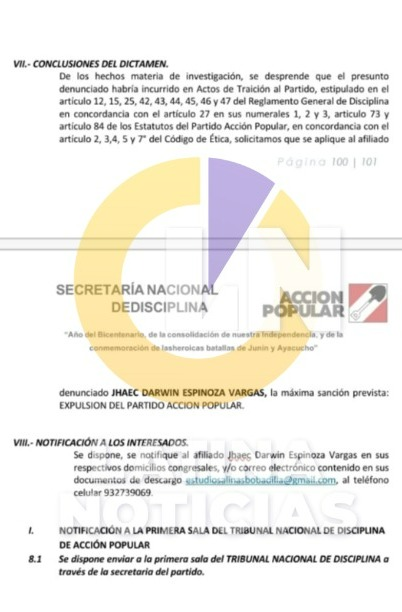 La Secretaria Nacional de Disciplina del partido político Acción Popular recomendó la destitución del congresista Darwin Espinoza de la agrupación política, esto tras el reportaje de Punto Final que reveló el intercambio de favores de Darwin Espinoza con la congresista Kira Alcarraz de Podemos Perú.