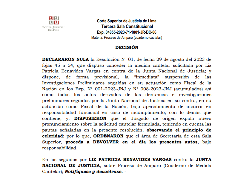 La Tercera Sala Constitucional de Lima anuló la medida cautelar otorgada por la jueza Jacqueline Tarrillo a favor de la fiscal de la Nación, Patricia Benavides, para que la Junta Nacional de Justicia (JNJ) suspenda las investigaciones contra la fiscal de la Nación.