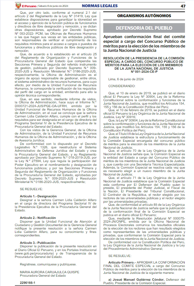 La resolución 001-2024-CE-P fue publicada este sábado 8 de junio en el diario oficial El Peruano.
