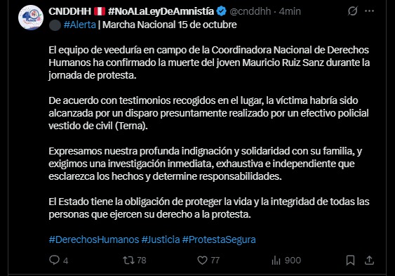 Por su parte, la Coordinadora Nacional de Derechos Humanos (CNDDHH) señaló que el fallecido es Mauricio Ruiz Sanz y que, de acuerdo con testimonios recogidos en el lugar, la víctima habría sido alcanzada por un disparo presuntamente realizado por un policía vestido de civil.