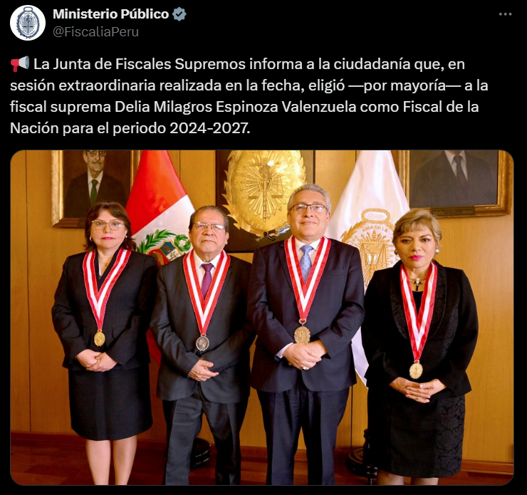 “La Junta de Fiscales Supremos informa a la ciudadanía que, en sesión extraordinaria realizada en la fecha, eligió —por mayoría— a la fiscal suprema Delia Milagros Espinoza Valenzuela como Fiscal de la Nación para el periodo 2024-2027”, es el texto que acompañó a la imagen.