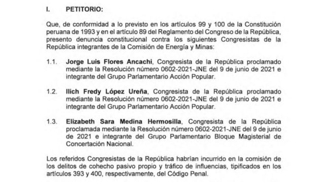 Luego, presentaron cuatro proyectos legislativos: 2139/2021-CR, 3662/2022-CR, 4565/2022-PE y 4748/2022-CR, los cuales proponen, con texto sustitutorio, “Ley que modifica la Ley 28832, Ley para asegurar el desarrollo eficiente de la generación eléctrica, a fin de garantizar el abastecimiento seguro, confiable y eficiente del suministro eléctrico y promover la diversificación de la matriz energética”. Este dictamen fue aprobado y firmado por los congresistas denunciados.