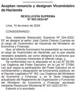 La oficialización de este cambio se hizo esta mañana en la Resolución Suprema N° 002-2024-EF, a través de las normas legales publicadas en el diario oficial El Peruano. El Ejecutivo ha expresado su confianza en Baca Gómez Sánchez para desempeñar un papel crucial en el área financiera del país.