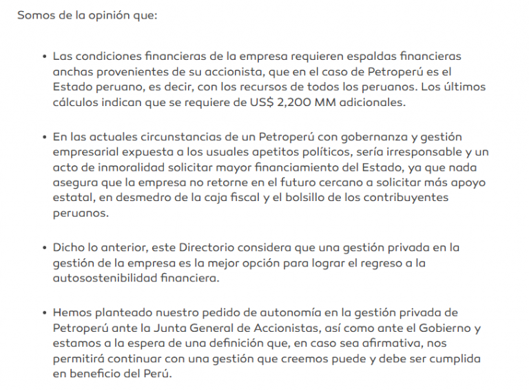 «Hemos planteado nuestro pedido de autonomía en la gestión privada de Petroperú ante la Junta General de Accionistas, así como ante el Gobierno y estamos a la espera de una definición que, en caso sea afirmativa, nos permitirá continuar con una gestión que creemos puede y debe ser cumplida en beneficio del Perú«, se lee en el pronunciamiento.