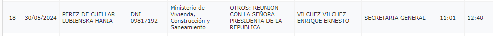 Alrededor de las 11 de la mañana, de acuerdo a la página de Transparencia, la presidenta Dina Boluarte, recibió la visita de Hania Pérez De Cuéllar, ministra de Vivienda, Construcción y Saneamiento.