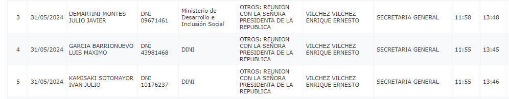 Por otro lado, de acuerdo al portal transparencia de despacho presidencial, se registró la asistencia de Luis Máximo García Barrionuevo, director de Inteligencia Nacional de la dirección Nacional de Inteligencia; Ivan Julio Kamisaki, director ejecutivo de la dirección Nacional de Inteligencia a las 11:55 de la mañana.