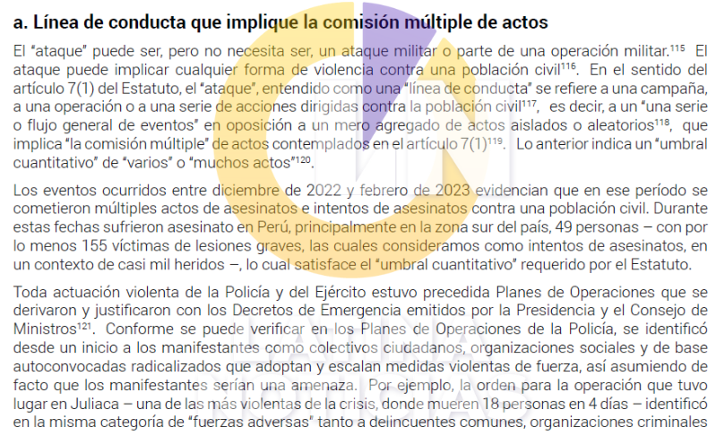 “Los eventos ocurridos entre diciembre de 2022 y febrero de 2023 evidencian que en ese período se cometieron múltiples actos de asesinatos e intentos de asesinatos contra una población civil. Durante estas fechas sufrieron asesinato en Perú, principalmente en la zona sur del país, 49 personas – con por lo menos 155 víctimas de lesiones graves, las cuales consideramos como intentos de asesinatos, en un contexto de casi mil heridos –, lo cual satisface el “umbral cuantitativo” requerido por el Estatuto”, se lee en el documento al que accedió Latina Noticias.