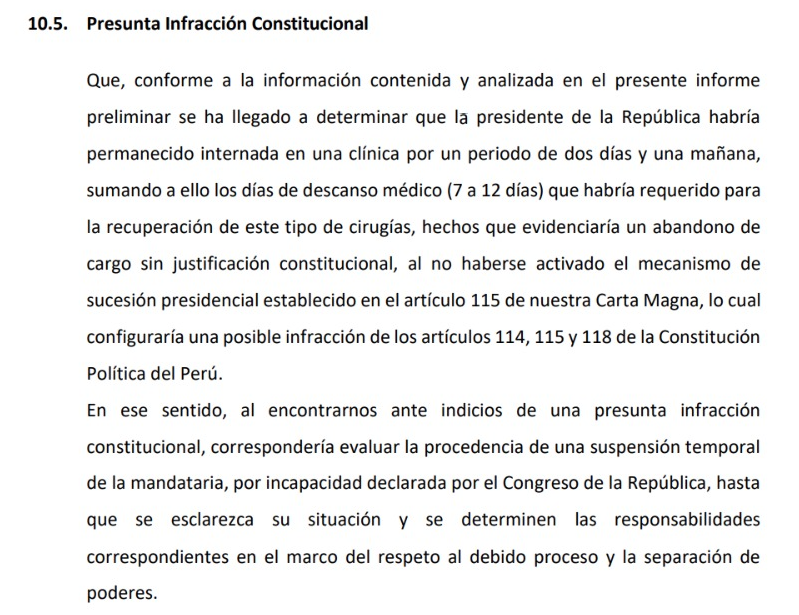 “La presidente de la República habría permanecido internada en una clínica por un periodo de dos días y una mañana, sumado a ello los días de descanso médico (7 a 12 días) que habría requerido para la recuperación de este tipo de cirugías, hechos que evidenciaría un abandono de cargo sin justificación constitucional“, se lee en el documento preliminar.