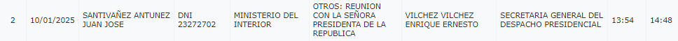 Finalmente, la jefa de Estado registra una reunión con el ministro del Interior, Juan José Santiváñez, entre las 1:54 y 2:48 de la tarde.