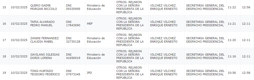 Tras ello, la jefa de Estado regresó a Palacio de Gobierno para sostener una serie de reuniones con varios funcionarios. Entre ellos, los ministros Morgan Quero (Educación), José Luis Montero (Energía y Minas), y el titular del Congreso de la República, Eduardo Salhuana.