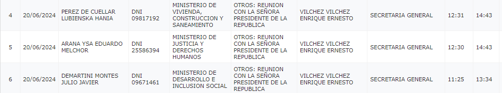 Por otro lado, de acuerdo al portal transparencia de despacho presidencial, se registró la asistencia de Hania Pérez de Cuellar, ministra de vivienda, construcción y saneamiento; Eduardo Arana, ministro de justicia y derechos humanos; y Julio Demartini, ministro de desarrollo e inclusión social. Los funcionarios se reunieron con la presidenta alrededor del mediodía.