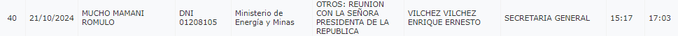 Luego, la mandataria se juntó con el ministro de Energía y Minas, Rómulo Mucho, entre las 3:17 a 5:03 de la tarde. Ese día, Boluarte Zegarra recibió también en su despacho a Jorge Pesantes Escalante, Alejandro Narváez y Edmundo Lizarzaburu entre las 3:44 a 5:00 de la tarde.