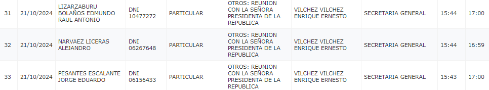 Sin embargo, no fue el único funcionario que estuvo en el Despacho Presidencial. El gobernador regional de Loreto, Jorge Chávez Silvano, se juntó con Boluarte Zegarra entre las 12:10 a 2:15 de la tarde.