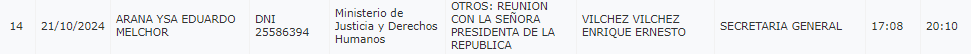 La jornada de hoy de la presidenta Dina Boluarte empezó hoy muy temprano con una reunión con el ministro de Justicia y Derechos Humanos, Eduardo Arana, que se registró entre las 10:46 de la mañana hasta la 1:40 de la tarde.