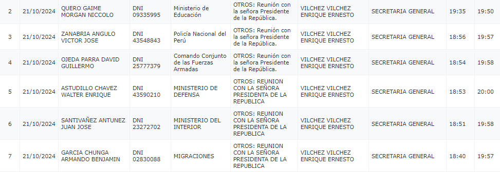 Tras esta actividad, la jefa de Estado se dirigió a Palacio de Gobierno. Según el portal de Transparencia, distintos funcionarios fueron llegando para reunirse con Boluarte Zegarra. Entre ellos se encontraban los ministros Eduardo Arana (Justicia), Raúl Pérez Reyes (Transportes), Walter Astudillo (Defensa), Juan José Santiváñez (Interior) y Morgan Quero (Educación).