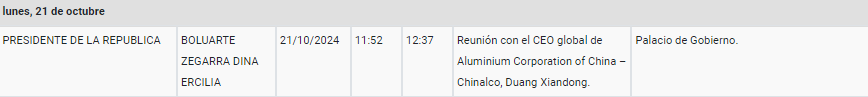 La semana empezó para la presidenta Boluarte con una reunión importante con el CEO global de la empresa Aluminium Corporation of China – Chinalco, Duang Xiandong, que se desarrolló entre las 11:52 de la mañana y 12:37 de la tarde.