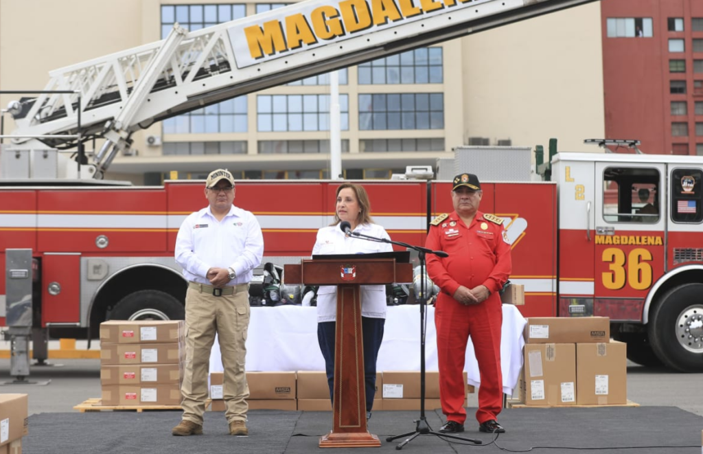 El miércoles 23, la presidenta Dina Boluarte estuvo acompañada junto al ministro del Interior, Juan José Santiváñez, durante la entrega de 620 equipos de protección de respiración autónoma al Cuerpo de Bomberos Voluntarios del Perú.