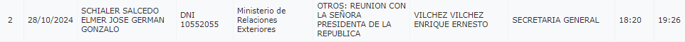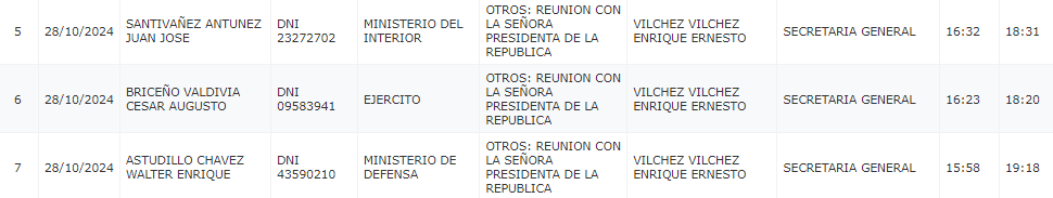 Boluarte estuvo en un encuentro de trabajo con Astudillo desde las 3:58 de la tarde hasta las 7:18 de la noche. Pero no fue el único porque el jefe del Ejército, César Briceño; el ministro del Interior, Juan José Santiváñez; y el canciller Elmer Schialer también fueron a la sede del Ejecutivo.
