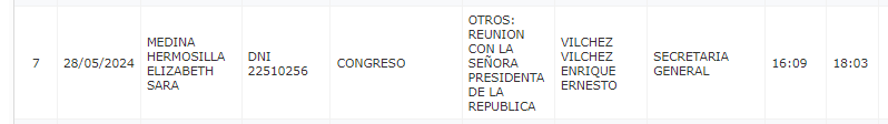 Por la tarde del martes 28 de mayo, según el portal Transparencia, se registró la visita de Elizabeth Medina, congresista de la república, a las 16:09 en el despacho presidencial. La reunión que sostuvo con la presidenta, según el registro, finalizó a las 18:03 de la tarde.