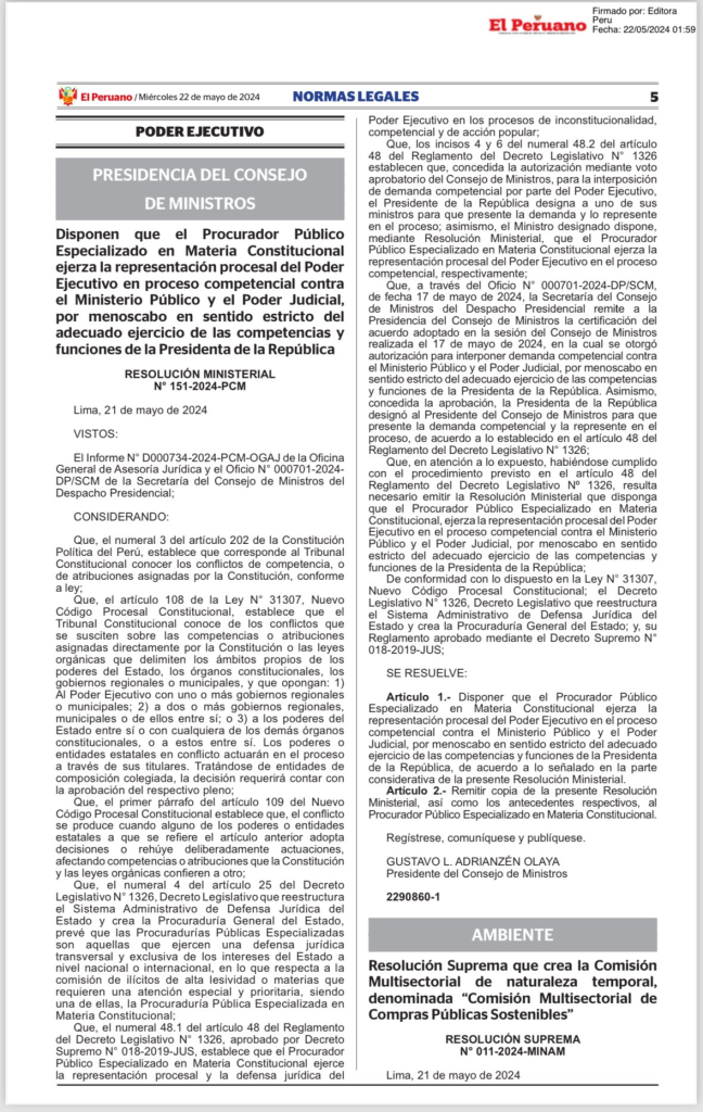En la mañana de este miércoles, se publicó en el Diario Oficial El Peruano la Resolución Ministerial 151-2024-PCM, que ordena al Procurador Público Especializado en materia Constitucional presentar, en nombre de la Presidencia de la República, una demanda de competencia ante el Tribunal Constitucional contra la Fiscalía y el Poder Judicial por un presunto «menoscabo» de sus competencias.