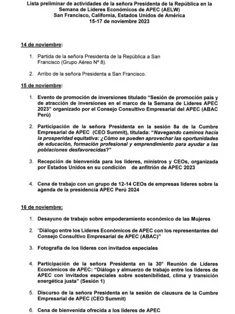 La autorización del pleno del Congreso para este viaje se otorgó el pasado 9 de noviembre, lo que permitirá a la presidenta Dina Boluarte participar en la 30 Reunión de Líderes Económicos de APEC que se llevará a cabo del 15 al 17 de noviembre. El permiso contempla que el viaje se extienda desde el 14 al 18 de noviembre.